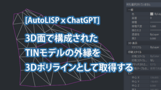 こんにちは、ISDです。今回も行ってみましょう、AutoLISP x ChatGPT ! 3D面で構成されたTINモデルの外縁を3Dポリラインとして取得する さて、今回のお題はこれです。「3D面で構成されたTINモデルの外縁を3Dポリライン...