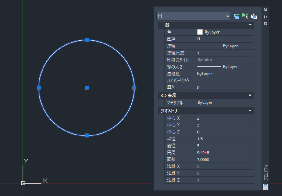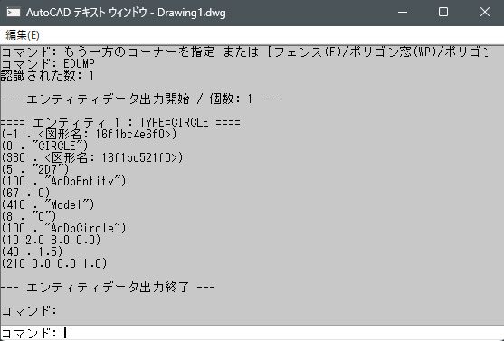 テキストウィンドウに、円オブジェクトのエンティティデータが表示されました!