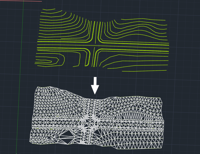 点群を 2.5D地形TIN として XY平面で三角形分割 → 各頂点のZを使って 3DFACEの集合(TIN) を生成する。